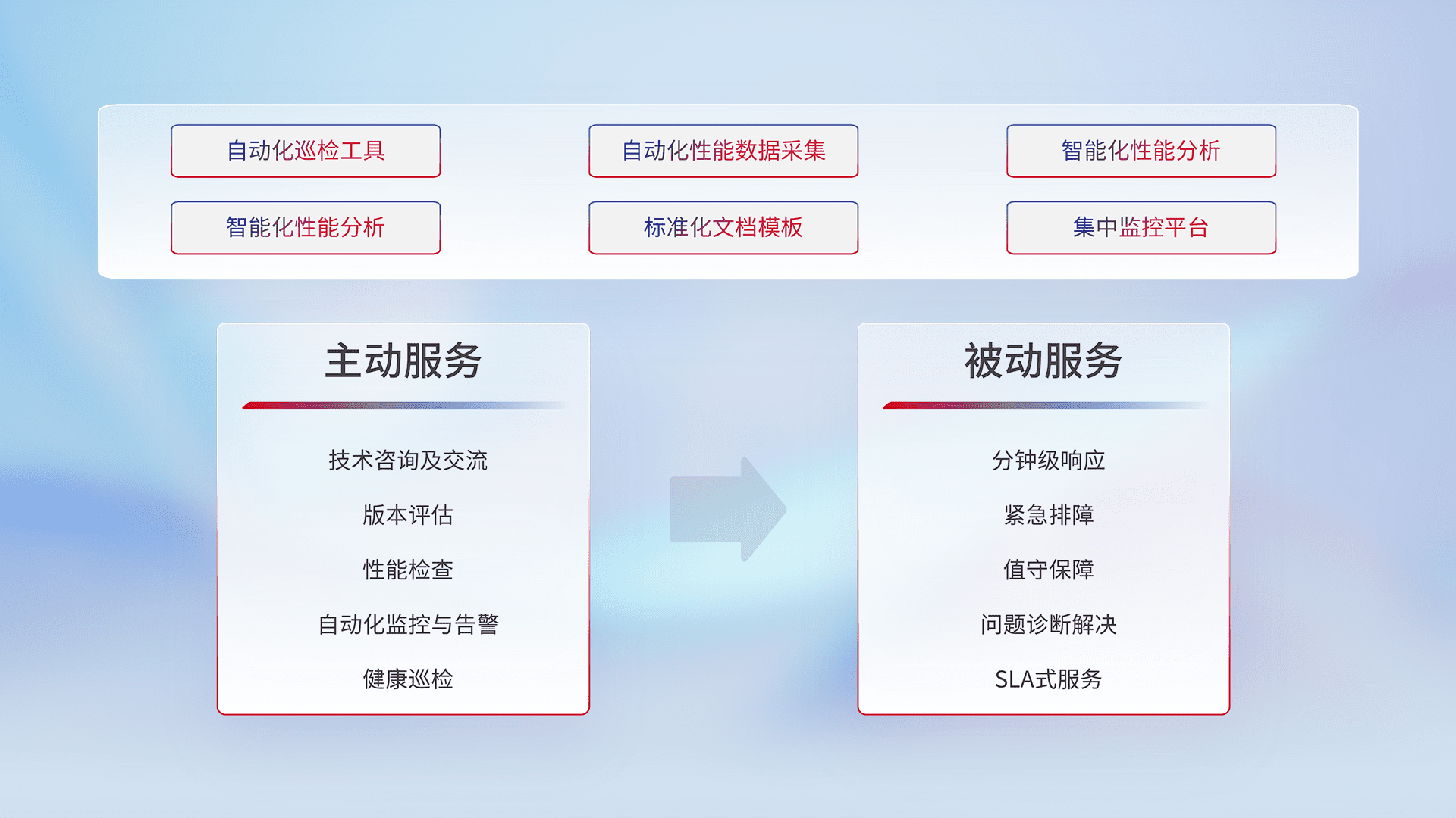 智能化工具和标准化文档,,,保障服务质量,,,提供主动服务(包含技术咨询、、、、版本评估、、性能检查、、自动化监控与告警、、健康巡检)和被动服务包含(分钟级响应、、紧急排障、、、值守保障、、问题诊断解决、、SLA服务)。。。。